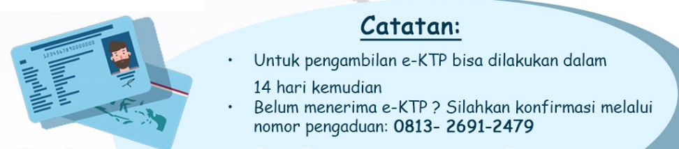 - Jika semua proses sudah selesai akan diberikan diberikan surat keterangan untuk ditunjukkan saat pengambilan e-KTP nanti, surat ini juga dapat menjadi Identitas sementara selama menunggu pengambilan e-KTP.