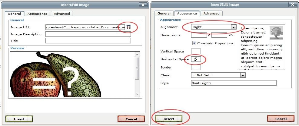 - To add images from your computer, click the “image” icon in any iDevice Editor window. The image has to be saved locally Copy & Paste is not possible. Choose the image from your computer (or a connected drive) by clicking on the folder symbol. Then go to the “Appearance” tab and choose how you would like your image to appear (e.g. right side of your screen with text wrap). Add some “Horizontal Space” to avoid the image sticking to too close to the text. Click insert.